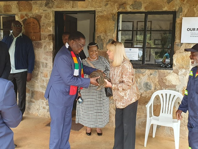 Afterwards His Excellency was presented with a carved stone Pangolin by Gill with the First Lady in attendance. His Excellency said that he was delighted to receive the sculpture which was hand crafted locally in Nyanga.